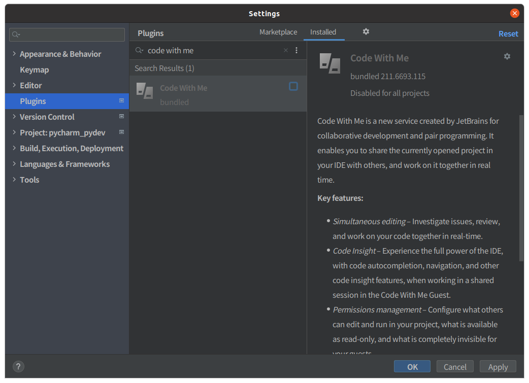 Code With Me : enable -> disable