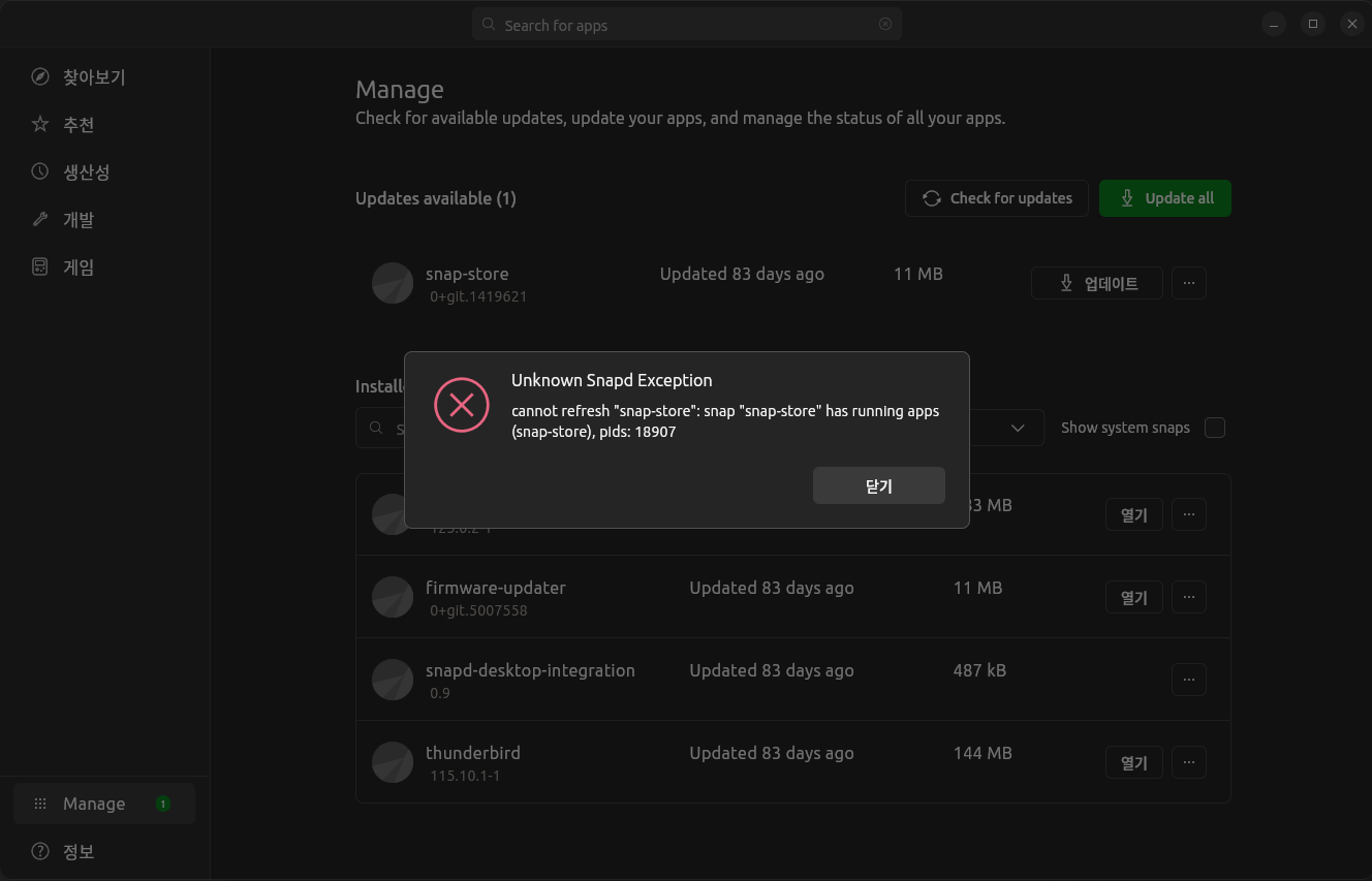 "snap-store"가 실행 중이라는 오류 메시지가 나오며 업데이트되지 않는다.