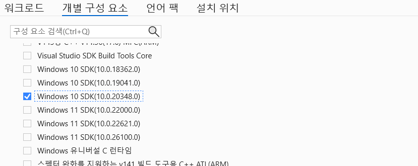- Windows 10 SDK(10.0.20348.0) 체크 (Windows 10 SDK 중에서 가장 높은 버전 체크)
