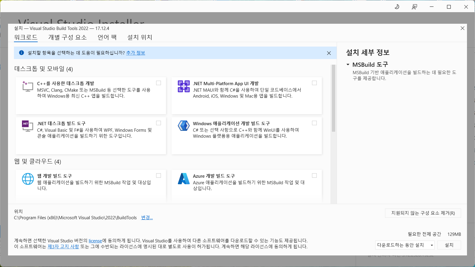 (Visual Studio Build Tools 설치 관리자 메인 화면)