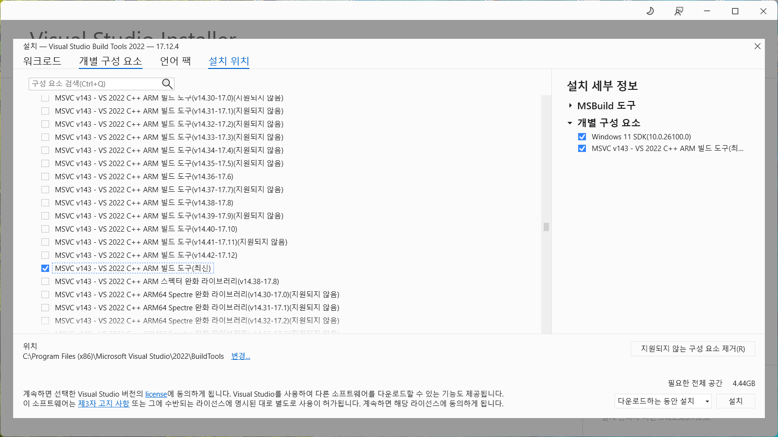 - Windows 11 SDK(10.0.26100.0) 체크 (Windows 11 SDK 중에서 가장 높은 버전 체크)