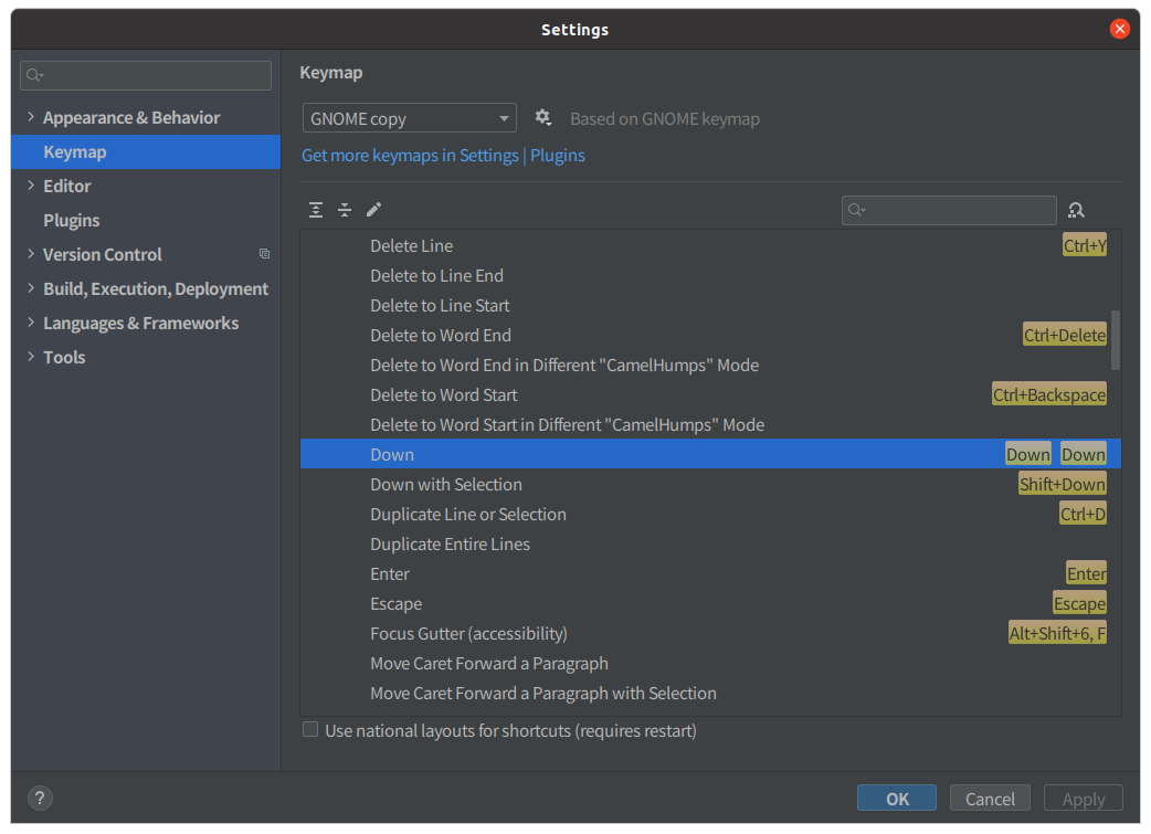 Intellij / Android Studio Scrolling with the number keypad when number lock is off Menu select File > Settings Popup Keymap > Editor Actions > Down (, Left, Right, Up) select - mouse left double click or right click > Add Keyboard Shortcut click > (number keypad) Down(, Left, Right, Up) Select > OK > Apply, OK 참조 : intellij-support.jetbrains.com/hc/en-us/community/posts/206345169-Scrolling-with-keys-on-numeric-keypad-with-num-lock-off OS/Ubuntu 2020.11.04