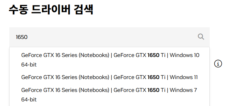 1. Nvidia 드라이버 다운로드 접속https://www.nvidia.com/ko-kr/drivers/ 최신 정식 NVIDIA 드라이버 다운로드최신 정식 NVIDIA 드라이버를 다운로드하여 PC 게임 경험을 향상시키고 앱을 더 빠르게 실행하세요.www.nvidia.com 2. 검색란에 "1650 ti" 입력 후 툴팁으로 나온 옵션 중 운영체계에 맞게 선택(예, Windows 11 / Windows 10 64-bit 등등) * 또는 [ 제품 범주 선택 ] : GeForce 선택[ 제품 시리즈 선택 ] : GeForce GTX 16 Series (Notebooks) 선택[ 제품 선택 ] : GeForce GTX 1650 Ti 선택[ 운영 체계 선택 ] : Windoes 10 64-bit 또는 Windo..